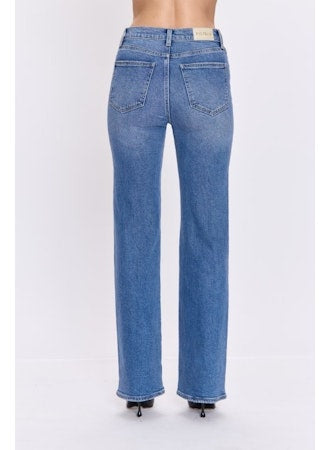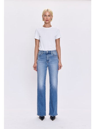 The slim boot that flatters every frame, Evie sits high at the waist with a slim fit through the hips and thighs that opens to a subtle flare, creating long, balanced lines. The full-length 33" inseam elongates the leg for a flattering finish. Crafted from comfort stretch denim in Illusion, a medium indigo wash with soft fading and whiskering that feels effortlessly lived-in.