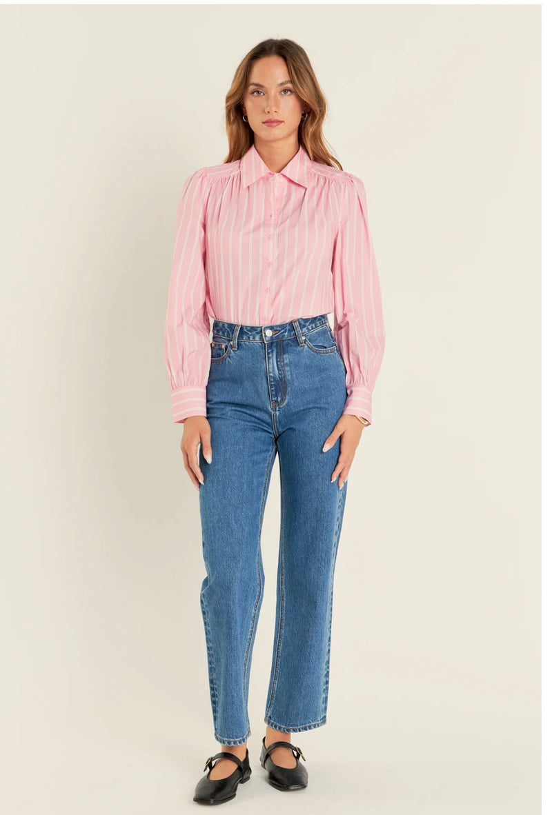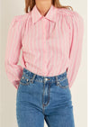 Elevate your wardrobe with our stunning Stripe Shirt in Pink - the perfect combination of style and comfort. The bold stripes add a timeless touch, while the collared neckline and puffed long sleeves with cuffs band exude sophistication. The front button closure allows for easy wear and a secure fit. This versatile shirt is a must-have for any fashion-forward individual. Whether dressed up for the office or dressed down for a casual outing, our Stripe Shirt is sure to turn heads. Embrace classic elegance with a modern twist. Shop now.