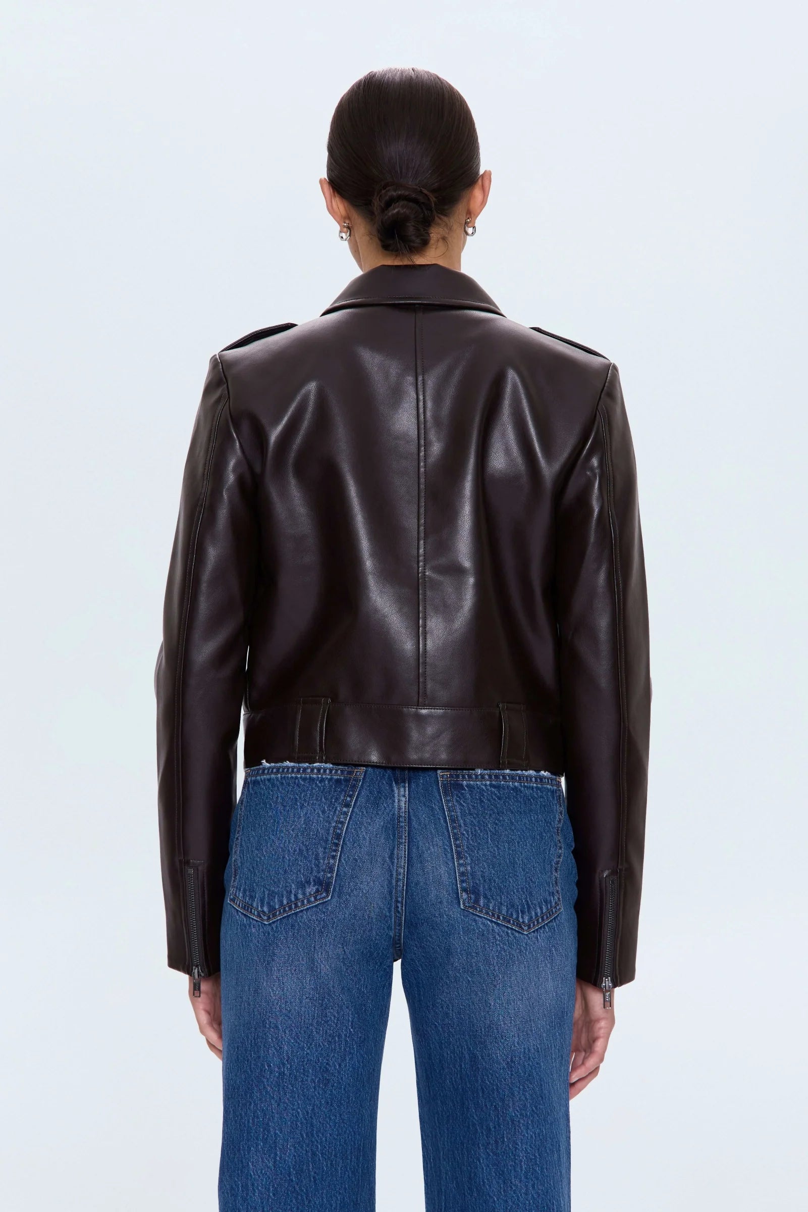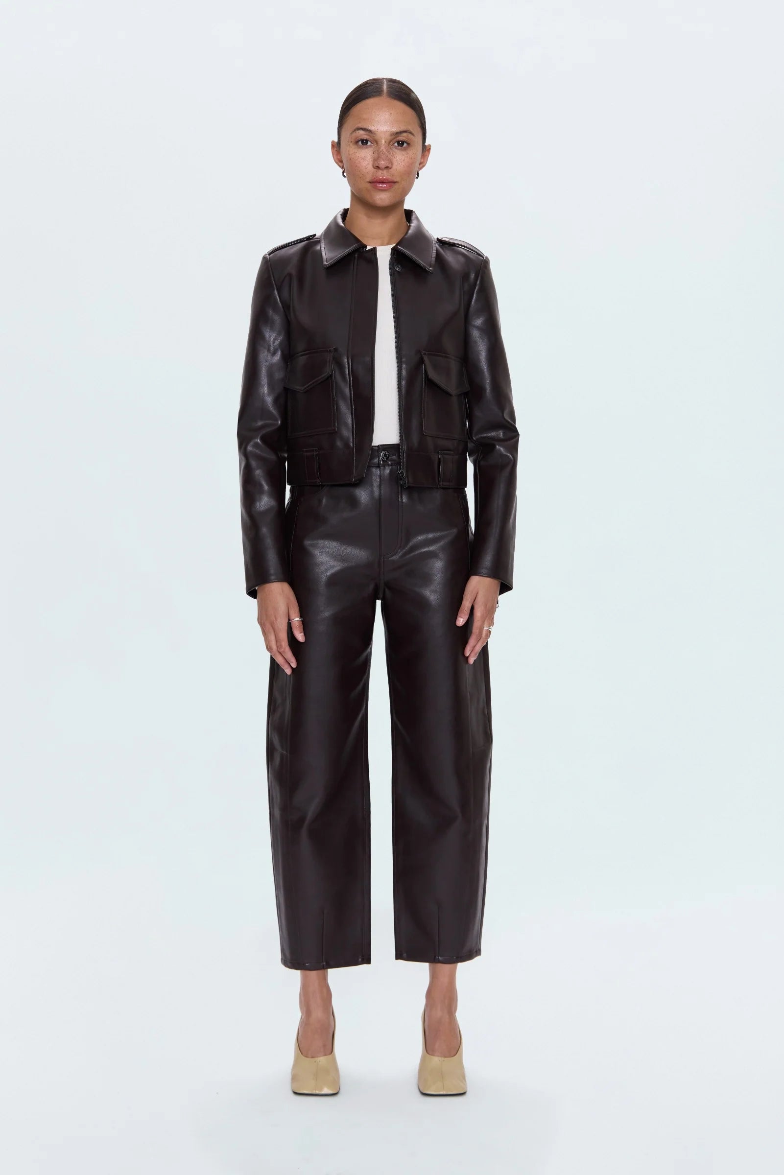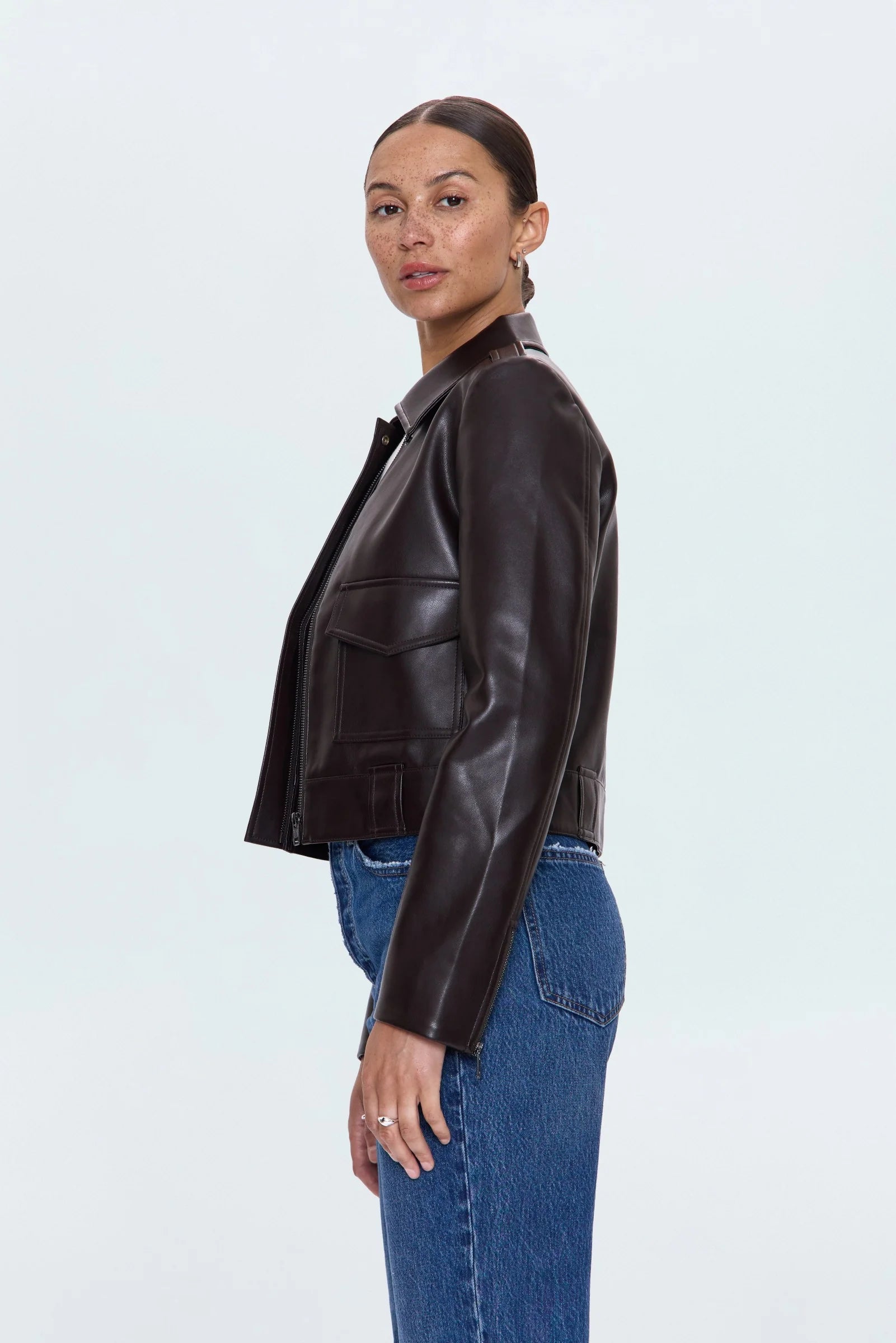A modern update to the classic leather jacket, Bex is cut with a cropped, shrunken fit that delivers edge without bulk. Designed with a sharp collar, front flap pockets, and sleek lines, it’s crafted from buttery soft alternative leather in French Roast, a deep brown with rich sheen, for a finish that feels both polished and cool.