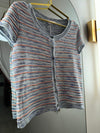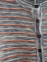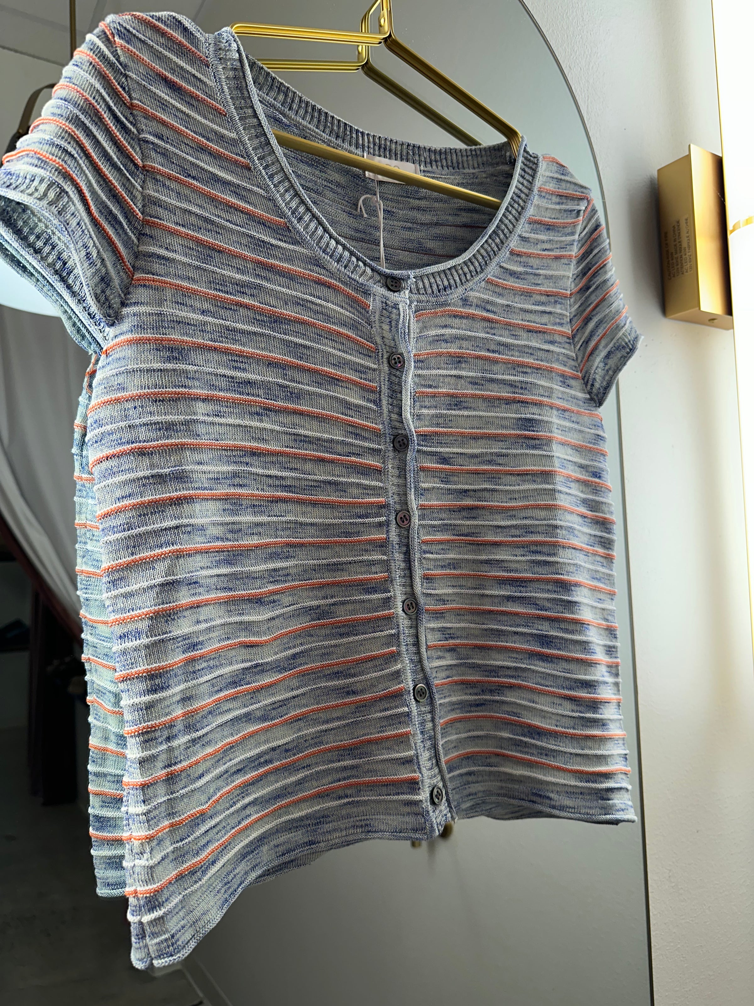 Short sleeve button down top in blue featuring orange and white raised stripes