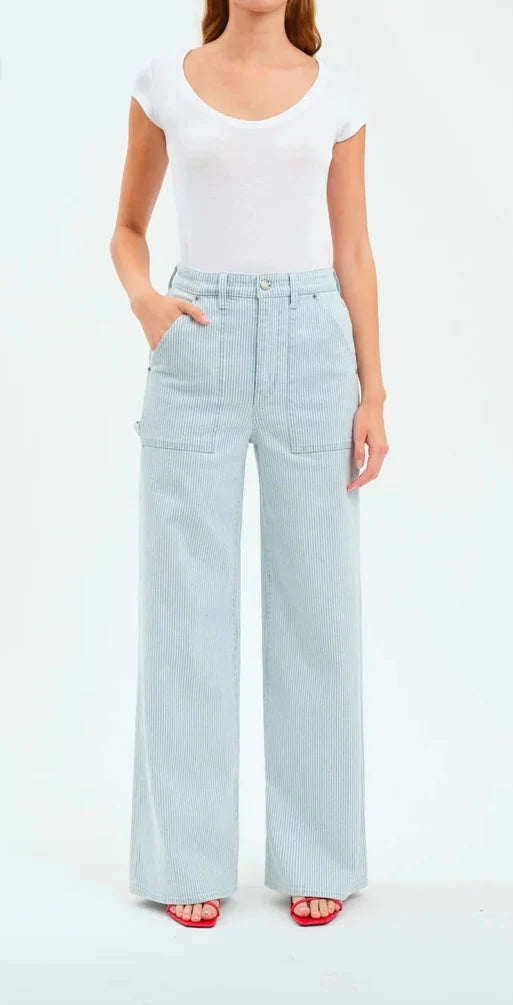 Featuring a wide leg design, this utility pant is perfect for any adventure. The blue and white railroad stripes add a touch of classic charm to your wardrobe.