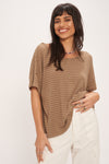 The Isadora Back Lace Up Striped Rib Easy Fit Tee features a relaxed fit, tonal striped rib fabric, scoop front neckline, and drop shoulders, creating an effortlessly comfortable style. The plunge back silhouette paired with the center lace-up detail will make this tee stand out all summer long.