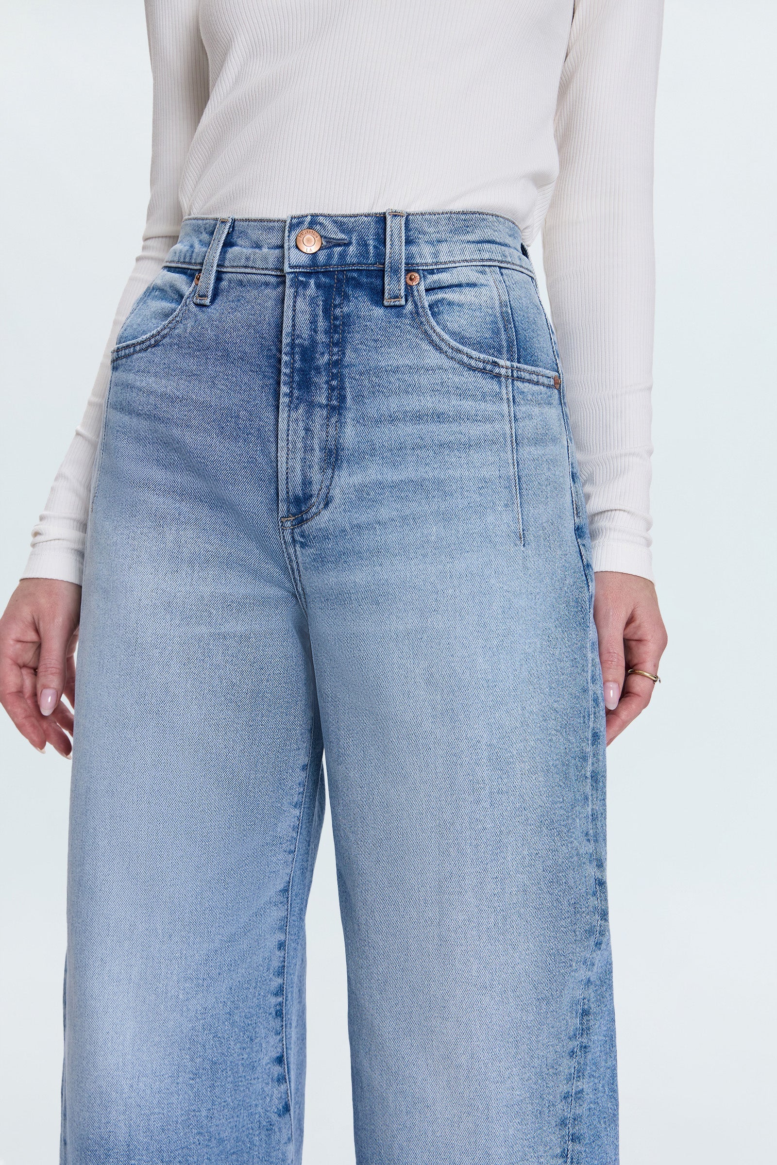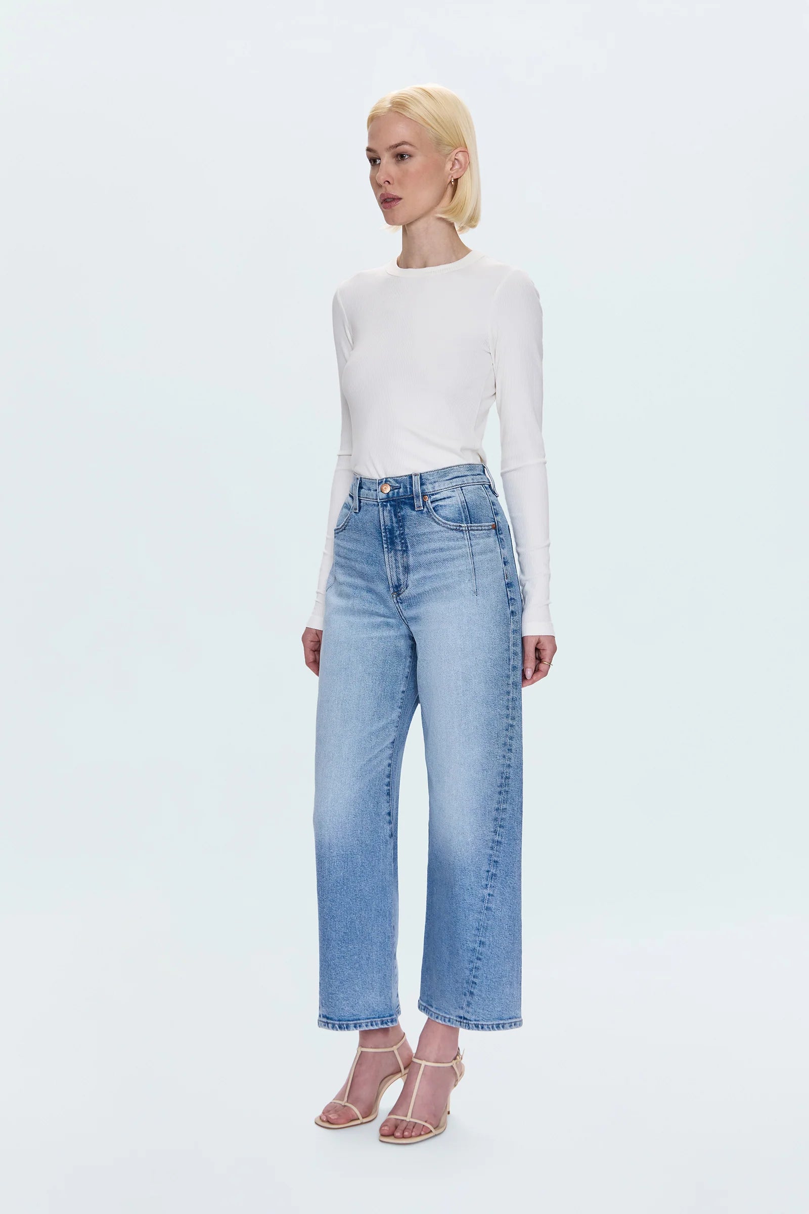 The new must-have jean with a twist. Kyra sits confidently at a high rise with our signature bowed leg silhouette and cropped 28" inseam. The subtle curve creates dimension while the wide ankle opening adds modern proportion with a new wide angle for the season. Fashion detail seaming, including a twisted seam that moves forward and yoke seams in the back, brings modern denim classic sophistication. Crafted from our signature comfort stretch denim in Terrace, a light vintage inspired wash with subtle fading that feels both contemporary and timeless.
