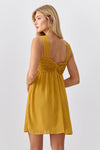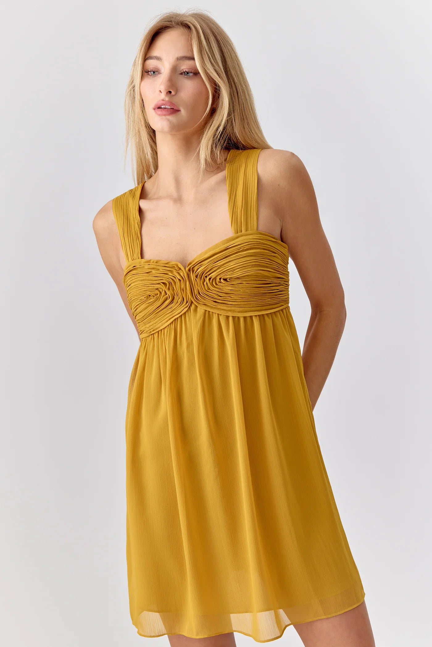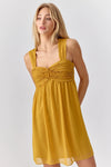 This chiffon, mini dress is installed with a gathered applique on the chest, creating a babydoll shape. The straps blend in well with a the same fabric manipulation.