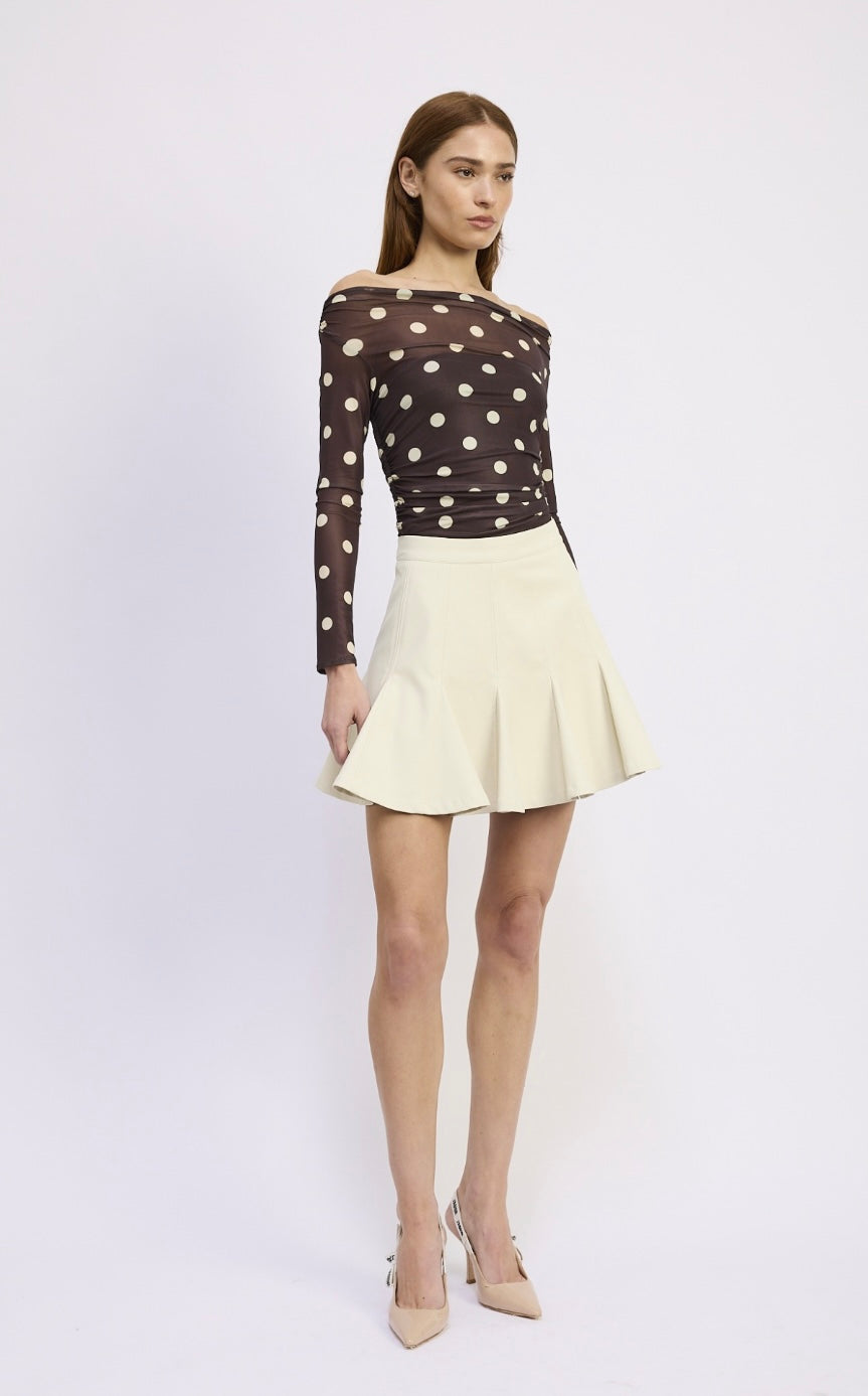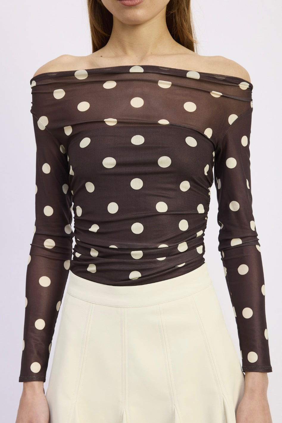 Elevate your wardrobe with the Lainey Mesh Bodysuit — a chic, modern take on classic polka dots. Designed with a lightweight sheer mesh, this off-the-shoulder silhouette offers a refined yet playful look that transitions effortlessly from day to night.