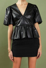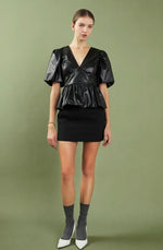 This leather blouson top is the perfect way to add some edge to your style. With its short puff sleeves and peplum hem, this top is sure to turn heads. The stretchy leather ensures a comfortable fit, while the side zipper allows you to easily slip it on and off. Dress it up or down, this top is a wardrobe must-have.