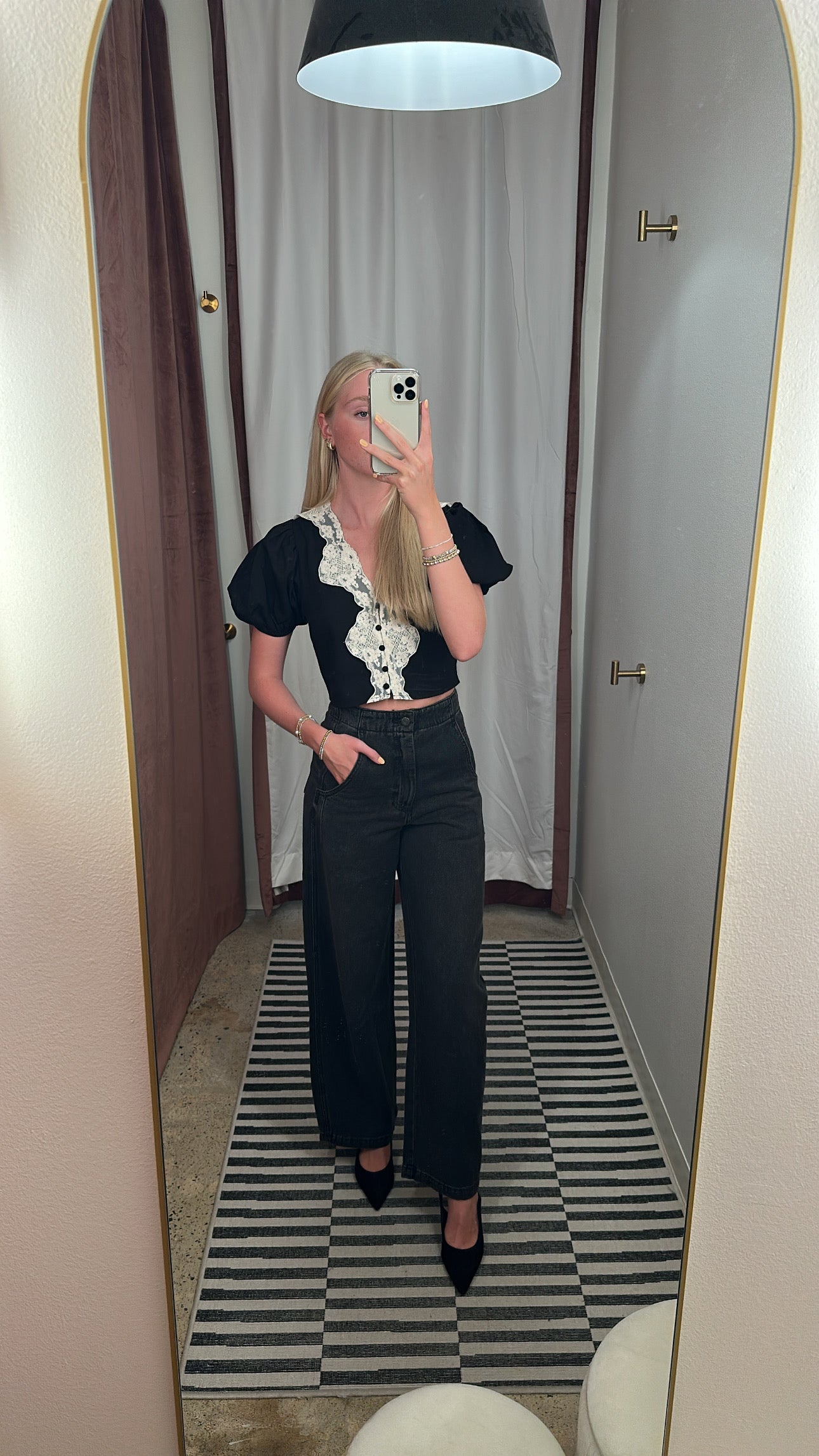 Button down shirt puff sleeve blouse featuring contrast lace