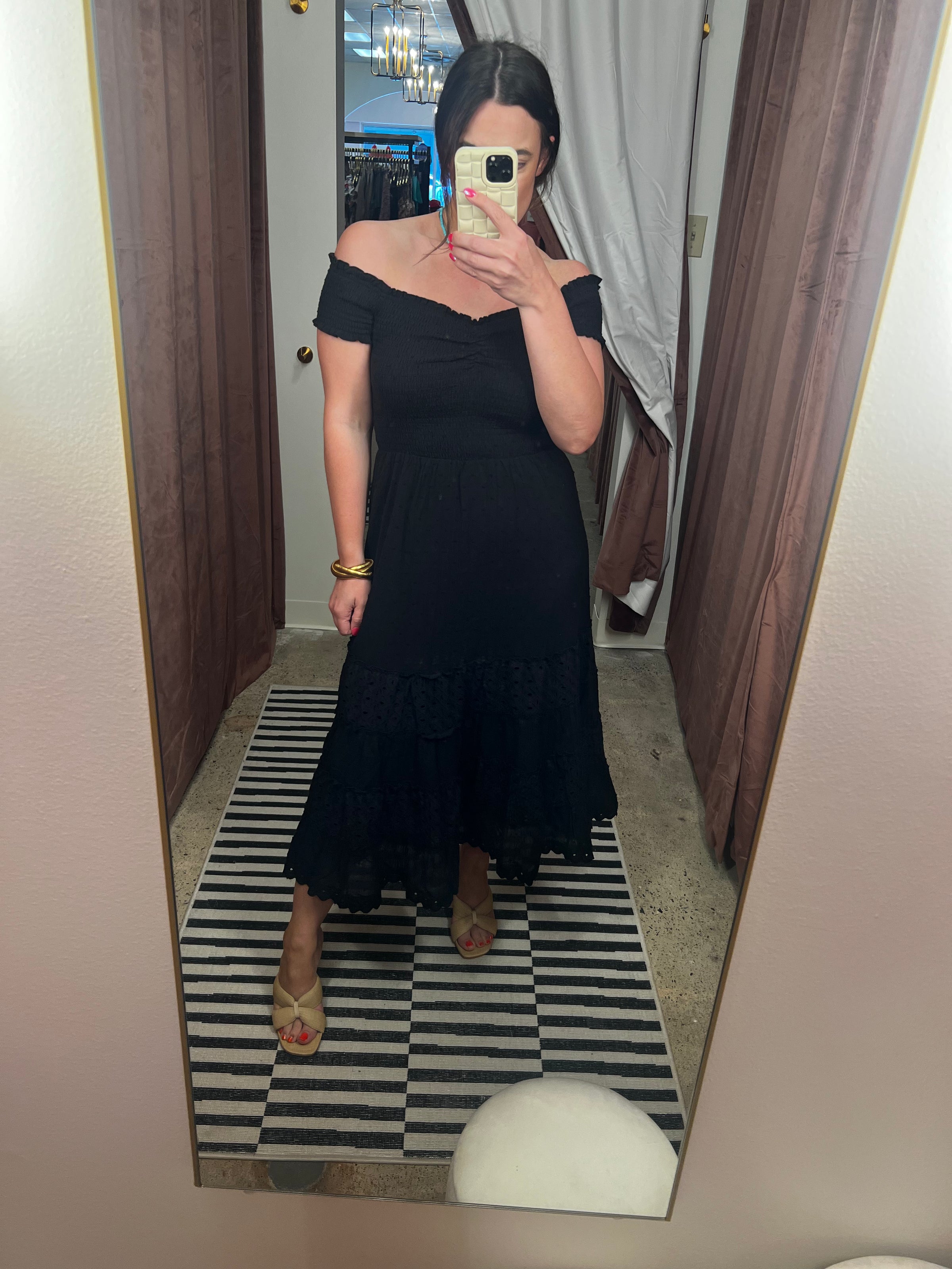 This Heartloom dress is a black maxi with an off the shoulder neck line.