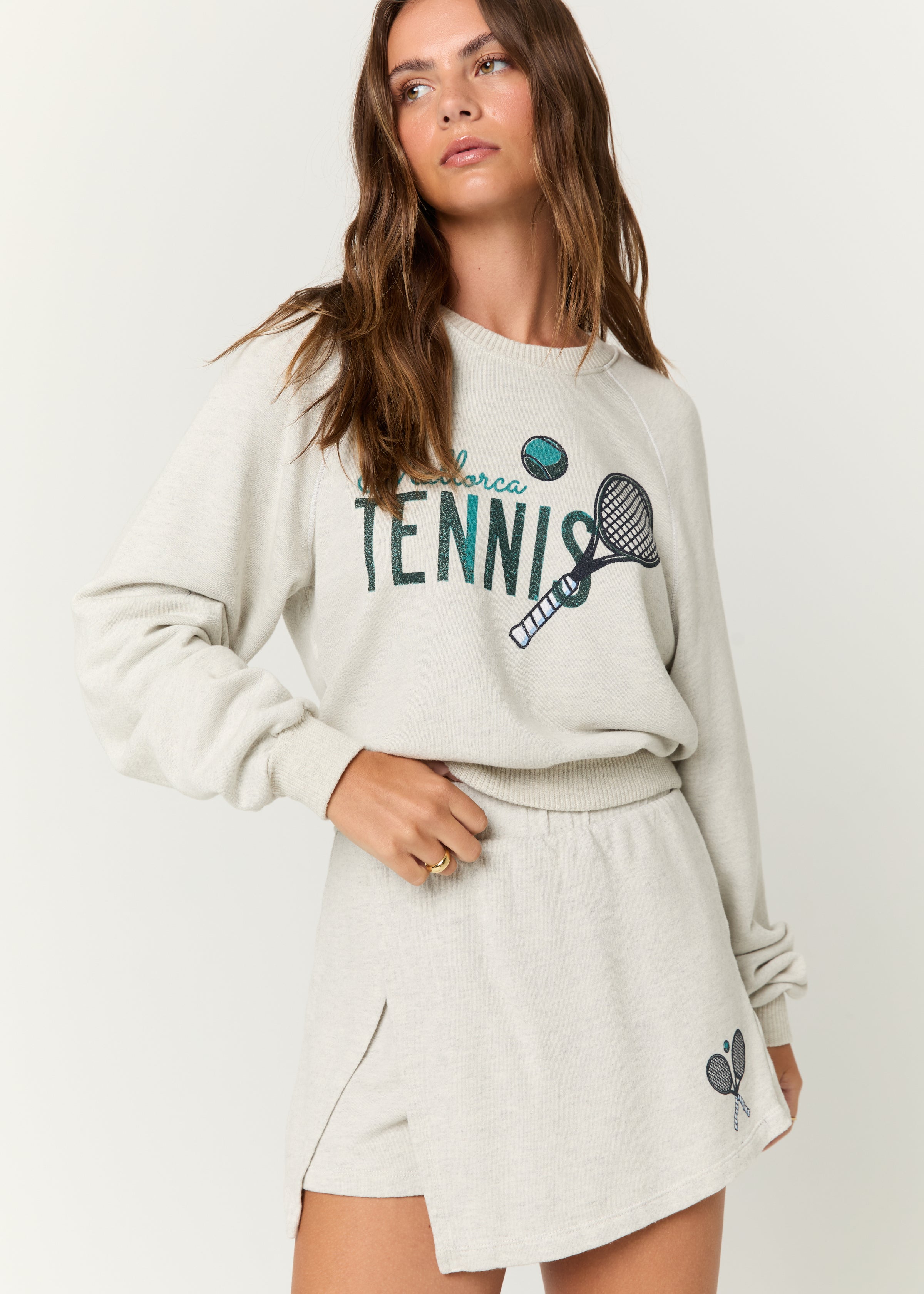The Mallorca Shrunken Sweatshirt blends comfort and style effortlessly. Featuring a soft meringue color, this sweatshirt is elevated by a bold graphic that pops against the light fabric. With a shrunken silhouette, crew neckline, and banded waist and cuffs, it’s the perfect mix of casual and eye-catching. Pair it with your favorite jeans or skirt to bring a splash of vibrant style to any look.