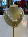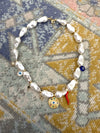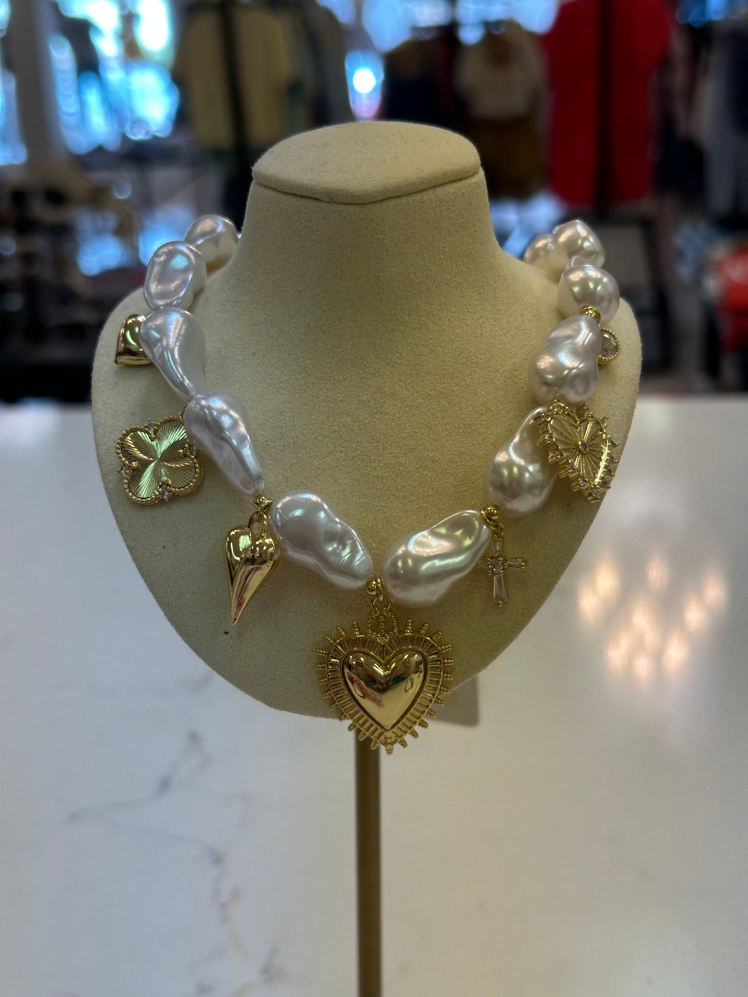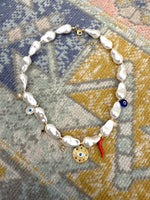 The Mia Necklace is a statement accessory with a soft, yet bold touch. This best-selling design features large misshapen pearls adorned with eight gold-plated charms, including an evil eye, CZ accented suns, oval eye, lightning bolt, CZ accented snake, red chili pepper, and blueish purple charms.