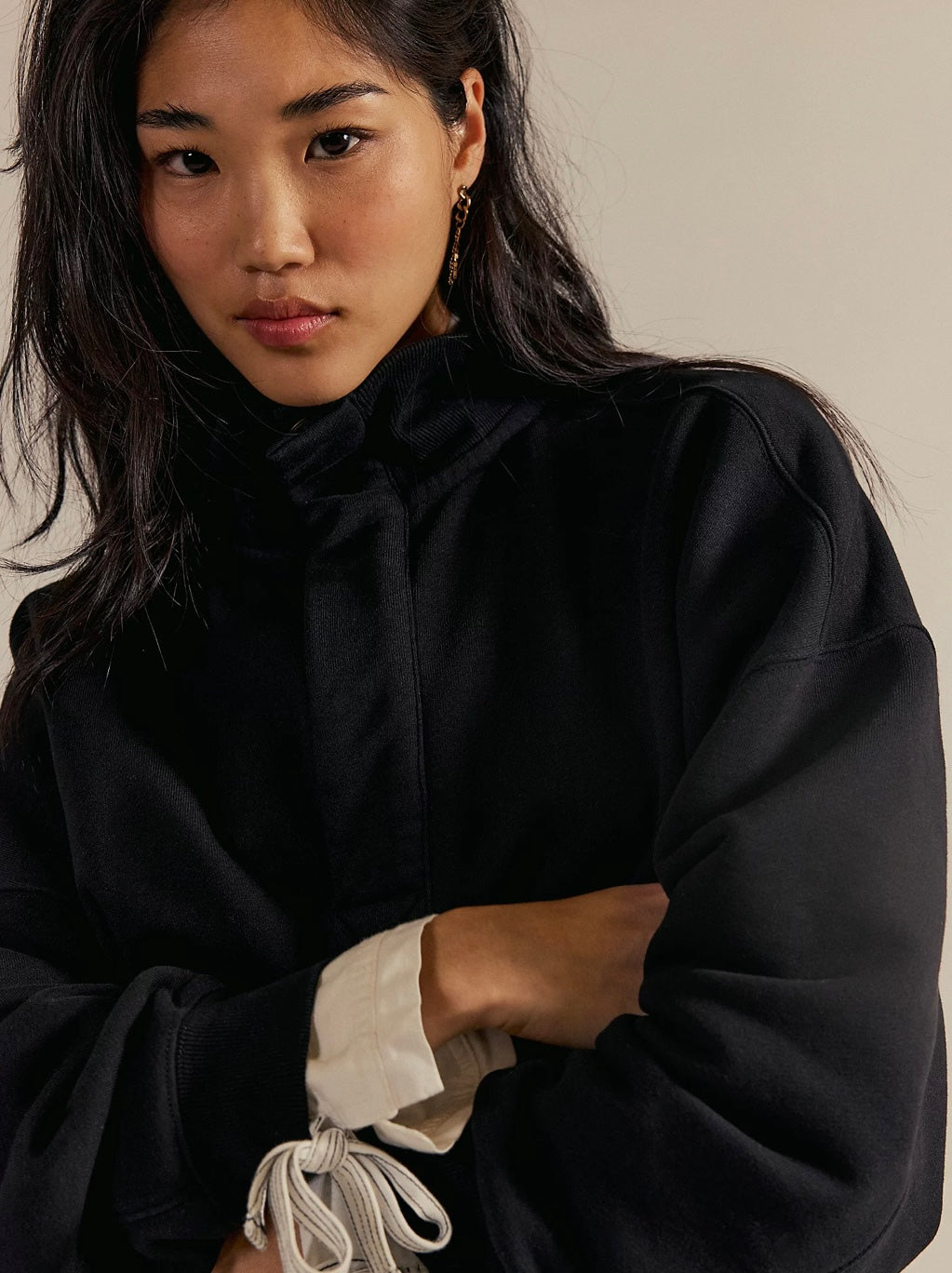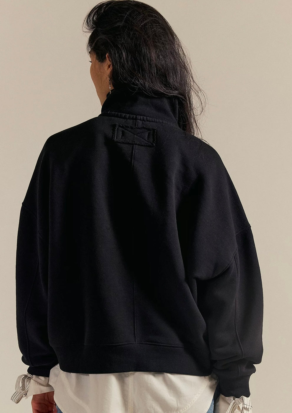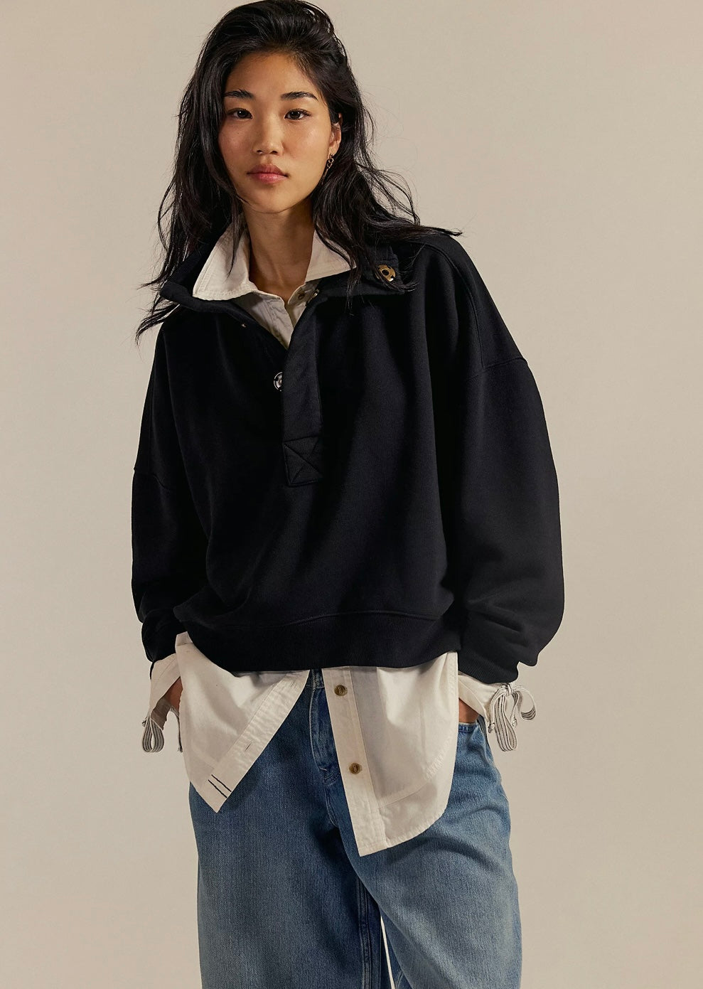So cozy and essential, this wear-everywhere pullover features a funnel neck design with quarter-button detail and ribbed trimming for added dimension.