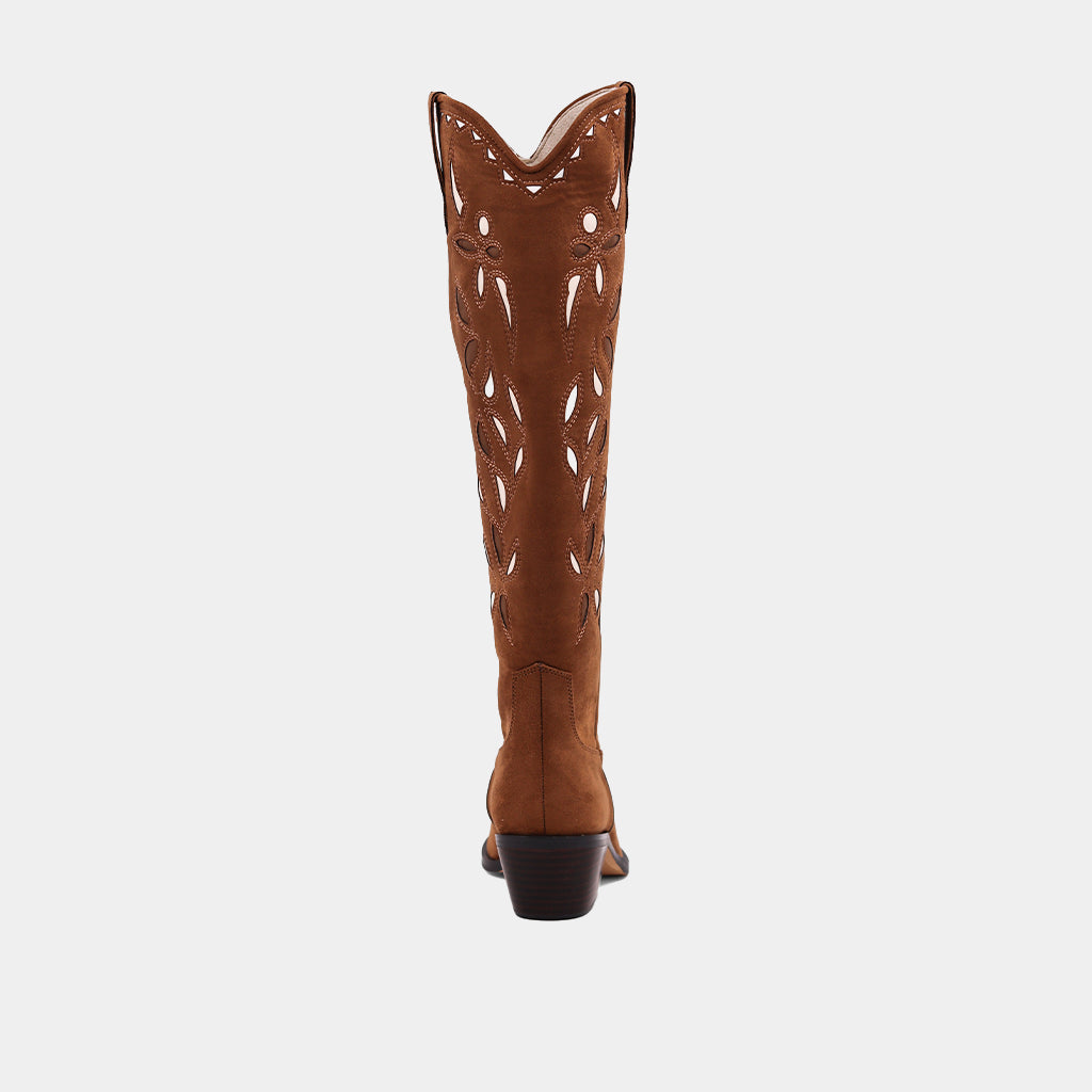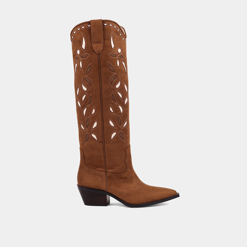 Kick up your style with these eye-catching Western-inspired boots, made from buttery suede with sleek faux leather cutouts. The bold design blends rustic charm with modern flair, while the comfy block heel keeps you grounded from day to night. Effortlessly chic and endlessly versatile, these boots are your new off-duty go-to for any adventure. Trendy, timeless, and seriously comfortable!